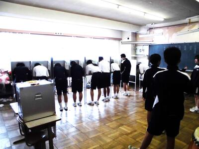 本日、生徒会選挙が行われ、第56期(前回、誤って55期としてしまいましたが、正しくは・・・)生徒本部役員が決まります。今回は会長・副会長・会計は定員=立候補で信任投票。書記は定員2、立候補3。総務は定員1、立候補5という激戦となりました。