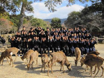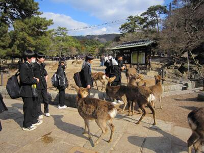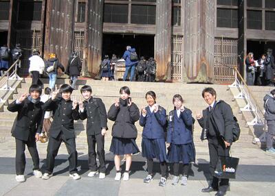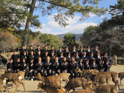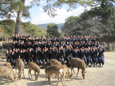 令和8年2月1日(日)修学旅行 奈良から京都へ 班別 投稿: 管理者 (16:50) 10:29に京都に到着して、一路、奈良へ。東大寺南大門付近で集合写真を撮って、大仏殿。そのあとは班別行動になります。春日大社・二月堂・三月堂・興福寺・平等院・京都タワー・東寺・西本願寺・六角堂・・八つ橋・抹茶パフェ等々・・・楽しい時間を過ごしてきたようです。この後帰着チェックです。全員元気です。 Tweet -