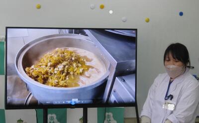まずは、栄養教諭や調理員さんの紹介の後、お礼のお手紙を給食委員会の代表者が読み上げました。それからプレゼントでハンドクリームを渡しました。そのあとは給食ができるまでの工程などを映像で栄養教諭さんが紹介してくださいました。工夫を凝らした、栄養を考えた、見た目もうれしい、しかも安価な・・・給食つくりの苦労が少しはわかったかな?これからも残さず、感謝の気持ちを忘れずに食べていきましょう。おいしい給食をいつもありがとうございます。