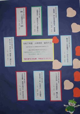 みんながおのおの考える心温まる言葉。一人一人の命や存在を大切にするために必要なもの。そんな言葉をポスターにしました。「言霊(ことだま)」いい言葉には人を幸せにする魂が宿ります。そんな温かな言葉が飛び交う東中に・・・そんな思いをこめた1時間になりました。